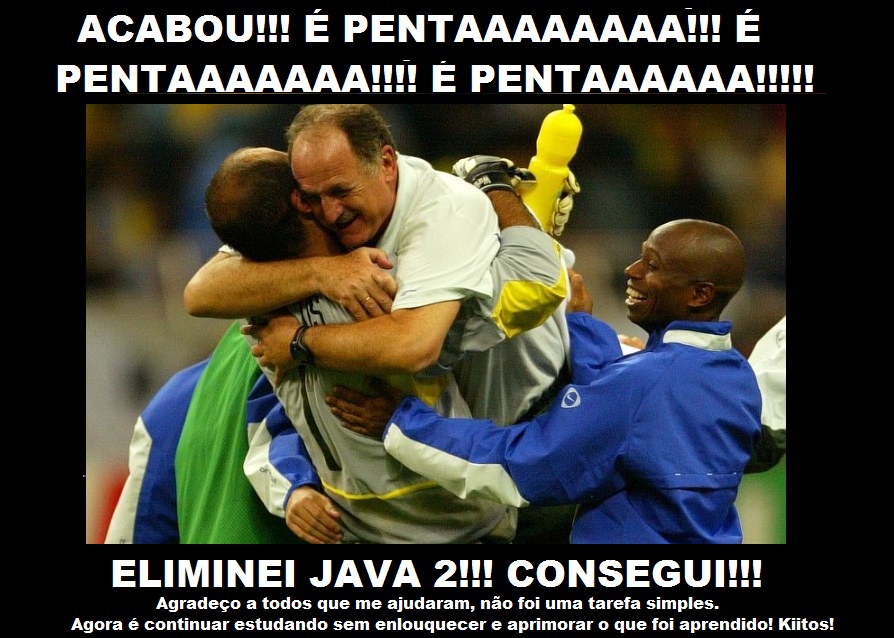Para complementar o post anterior, onde eu gritei “É TETRAAAAAA!!!” em alusão ao sentimento que tive ao ter passado em cálculo 2, aqui vai o “É PENTAAAAAA!!!”. Talvez porque Java seja 5 vezes mais difícil que derivadas, gráficos e integrais, não sei.