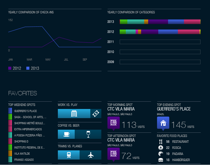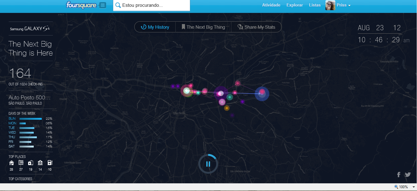 Você ainda pode ver em um gráfico a estatística de seus check-ins, isto é, quais lugares mais frequentou, número de check-ins dados