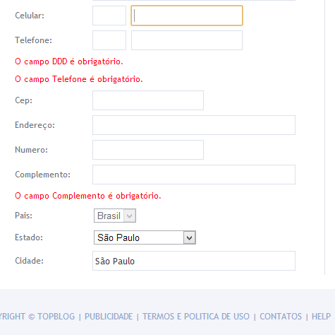 Usabilidade fail da noite: “O campo Telefone é obrigatório.” e “O campo Complemento é obrigatório.” Vamos deixar claro que em tempos modernos, atuais, hoje em dia, meu caro, NINGUÉM É OBRIGADO A TER UM TELEFONE FIXO para deixar o número. Tem gente, que como eu, USA APENAS O CELULAR! e mais ainda, se a casa não tem complemento, porque deixar isso obrigatório????