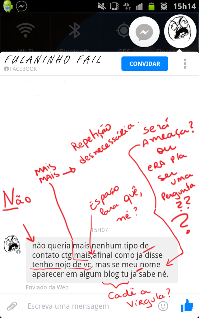 O comportamento de Fulaninho Fail [vamos chamá-lo assim] foi infantil novamente. Via inbox, achou que teria uma resposta minha na hora? Não, não teve. Apenas salvei o conteúdo para construir este post. Acha que vai ter uma resposta minha via inbox? Não, não terá. Aliás, quanto mais mensagens desse tipo você me mandar, mais posts surgirão. Tenho uma paleta de pincéis de memes muito bacana que já estava pegando poeira pela falta de uso.