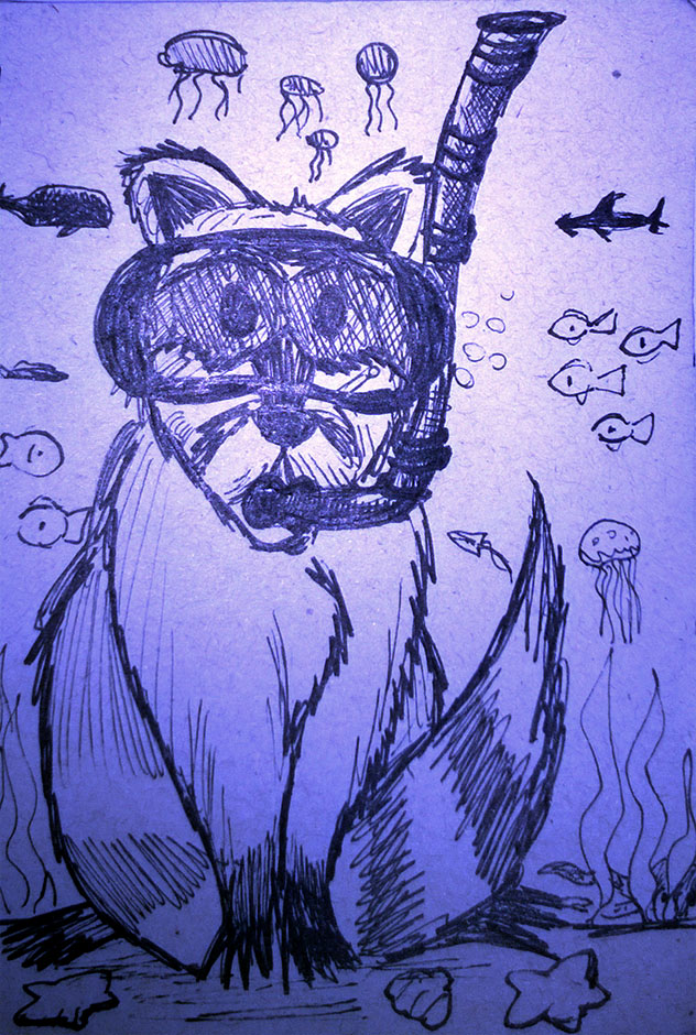 Não lembro mesmo o contexto em que isso surgiu na conversa, nem vou pesquisar, não estou curiosa a este ponto, mas o fato é que essa simples ideia, de um guaxinim marinho, me fez sair de um marasmo de ideias! Sim, eu estava sem inspiração para desenhar algo interessante e por conta dessa simples junção de duas palavras, guaxinim e marinho, BOOOOM!!! Fiz o desenho abaixo!