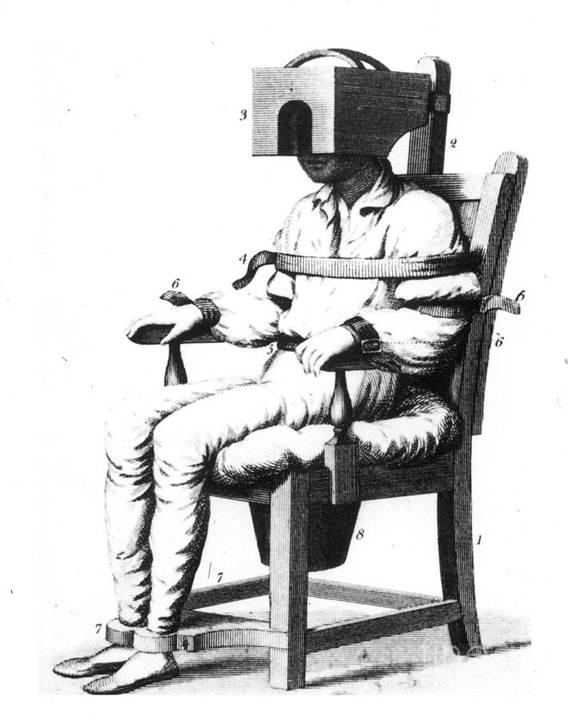 Detalhe: essa cadeira é real e foi usada na medicina para tratamento psiquiátrico no passado.