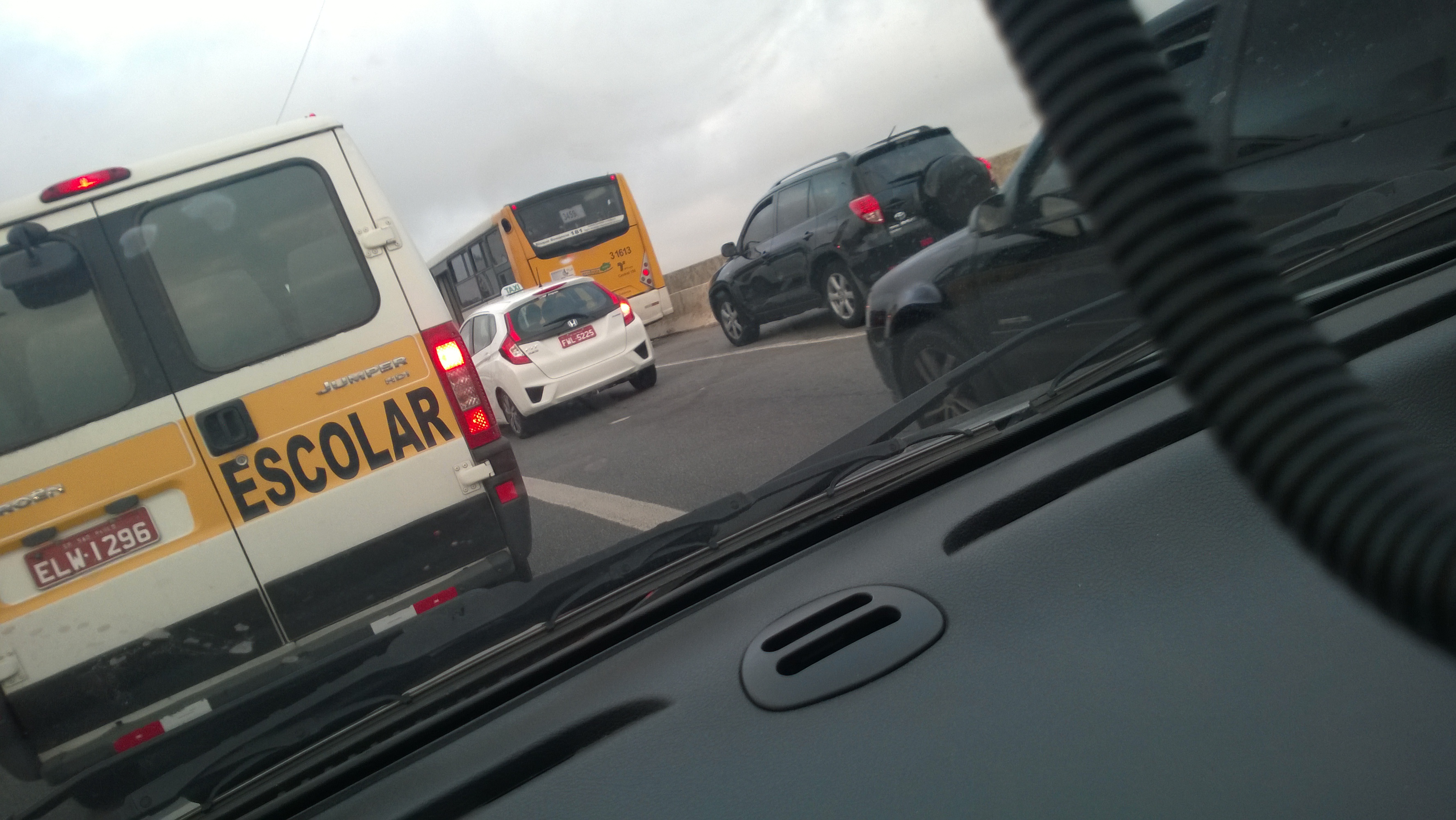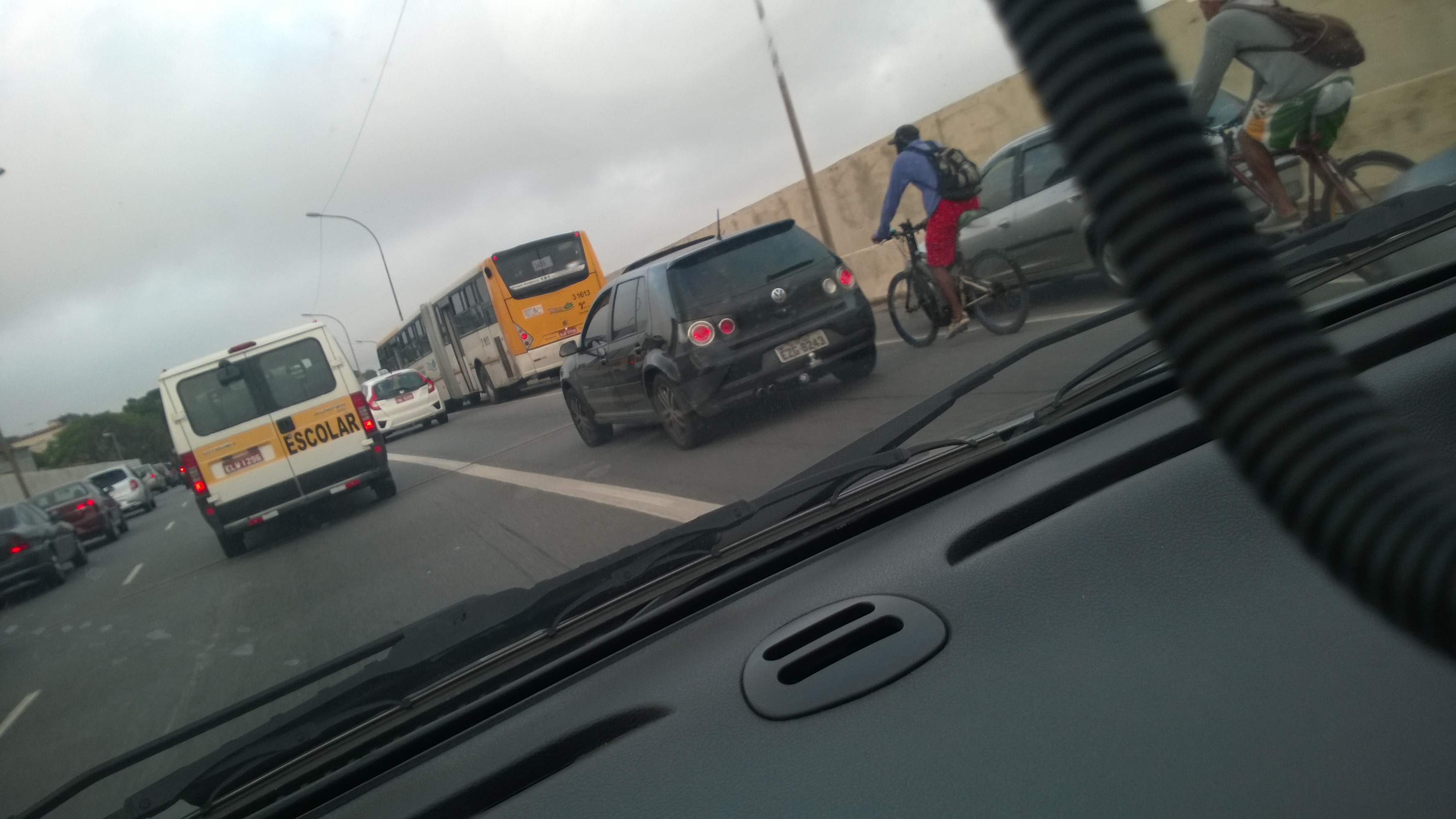 Tem de tudo aí. Carro circulando no acostamento, ônibus no acostamento, ciclista, é lindo demais! Só que não. E CET? Não sei onde eles andam. Não tem fiscalização. É uma pouca vergonha.