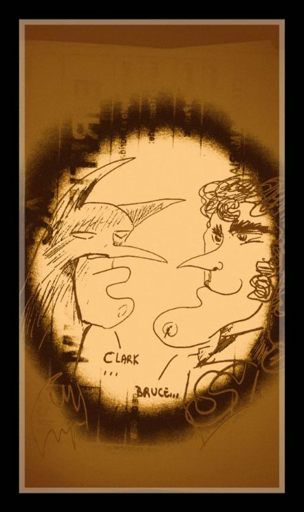 Para colaborar, o sistema ficou lento, então fiz o pequeno rabisco abaixo, num papel rascunho. É uma versão bizarra de Batman e Superman.