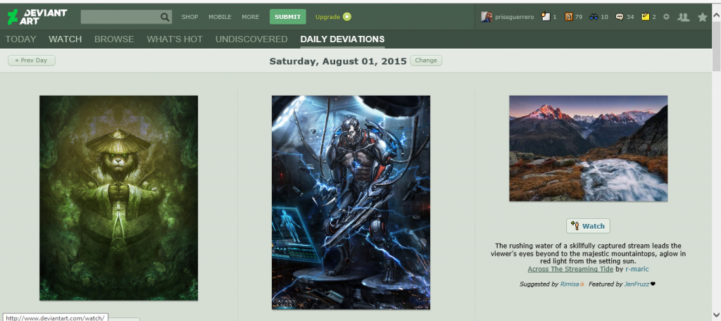 O legal do DeviantArt, é que você pode postar desde ilustrações até fotografias, vetores, gifs, filminhos (nunca tentei), conhecer artistas (os grandes estão lá também, por incrível que pareça!), seguir pessoas, conversar e tirar dicas e truques.