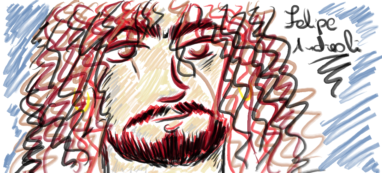 Resolvi desenhar um pouco mais hoje. Ainda tenho dificuldades em fazer curvas e círculos. Para amenizar isso, decidi desenhar alguém com cabelos cacheados, fui fazendo e saiu o Felipe Andreoli, do Angra… ou quase um Felipe!