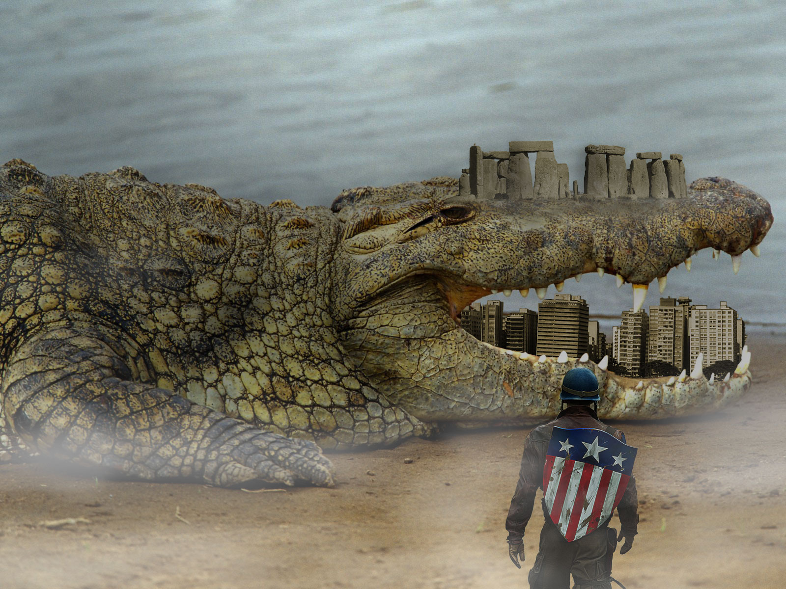 Resolvi colocar uma cidade dentro da boca dele. Precisava colocar os prédios tortos, para simular a língua do animal. Bom, acabei pegando a cidade de Santos, cujos prédios estão levemente tortos, do jeito que eu precisava.