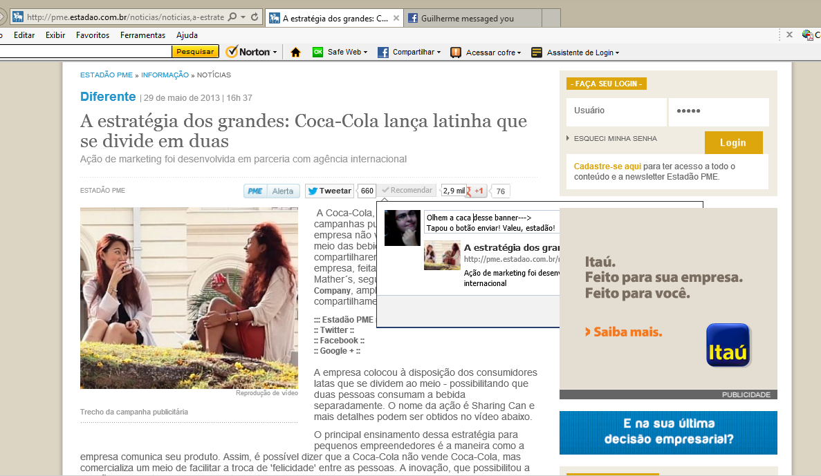 Vejam o que dá um mau dimensionamento de site: Não posso compartilhar a notícia com amigos por conta desse banner monstruoso do Itaú que está tapando o botão enviar. Também não há teclas de atalho. Ficou clara a falta de usabilidade do site do Estadão. Tudo porque devem estar ganhando muito dinheiro com este banner.