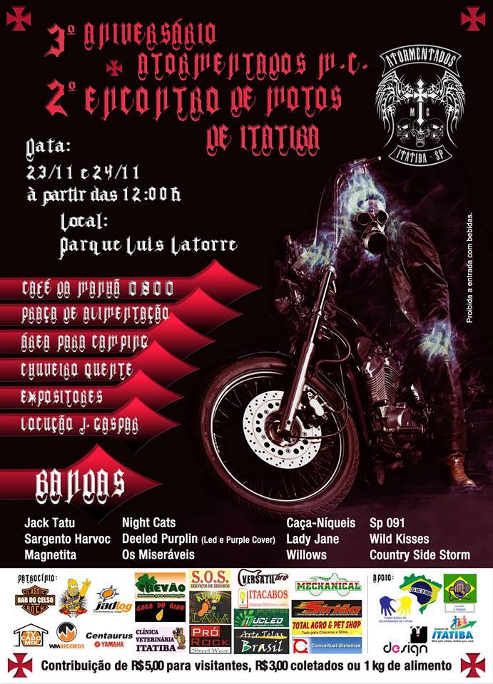 “Nós do Atormentados moto clube de Itatiba temos mais uma vez orgulho em anunciar mais um evento nosso na cidade, nosso 3° aniversário e o 2° encontro de motos de Itatiba.
