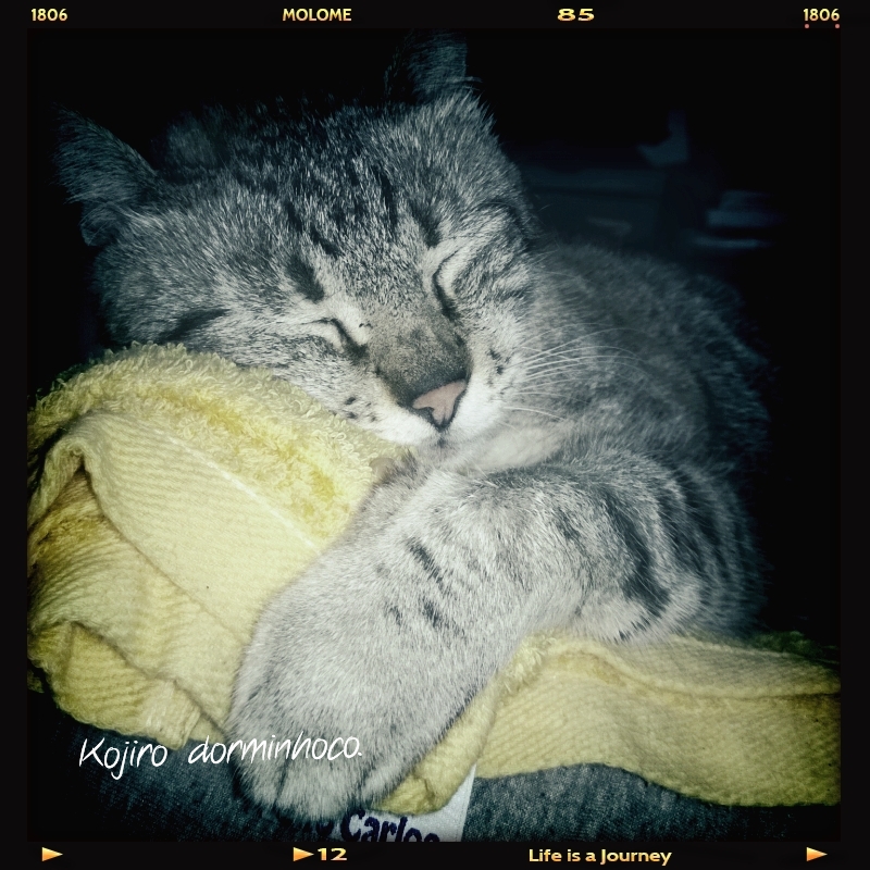 Este post é só para lembrar a vocês que o meu gato é o Kojiro e que ele emana fofura enquanto dorme. Especialmente se estiver abraçado a uma toalha e se a foto tiver efeitos produzidos pelo aplicativo Molome para Windows Phone.