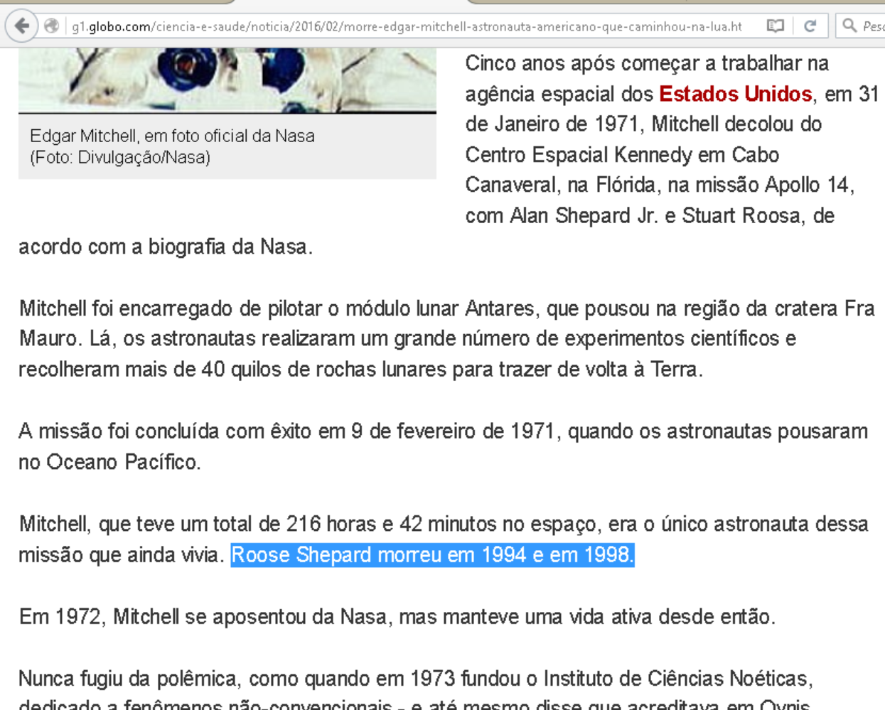 E lá estava eu lendo a notícia da morte do Astronauta Edgar Mitcthell, quando descubro acidentalmente que o Sheppard morreu duas vezes, segundo fontes do G1: